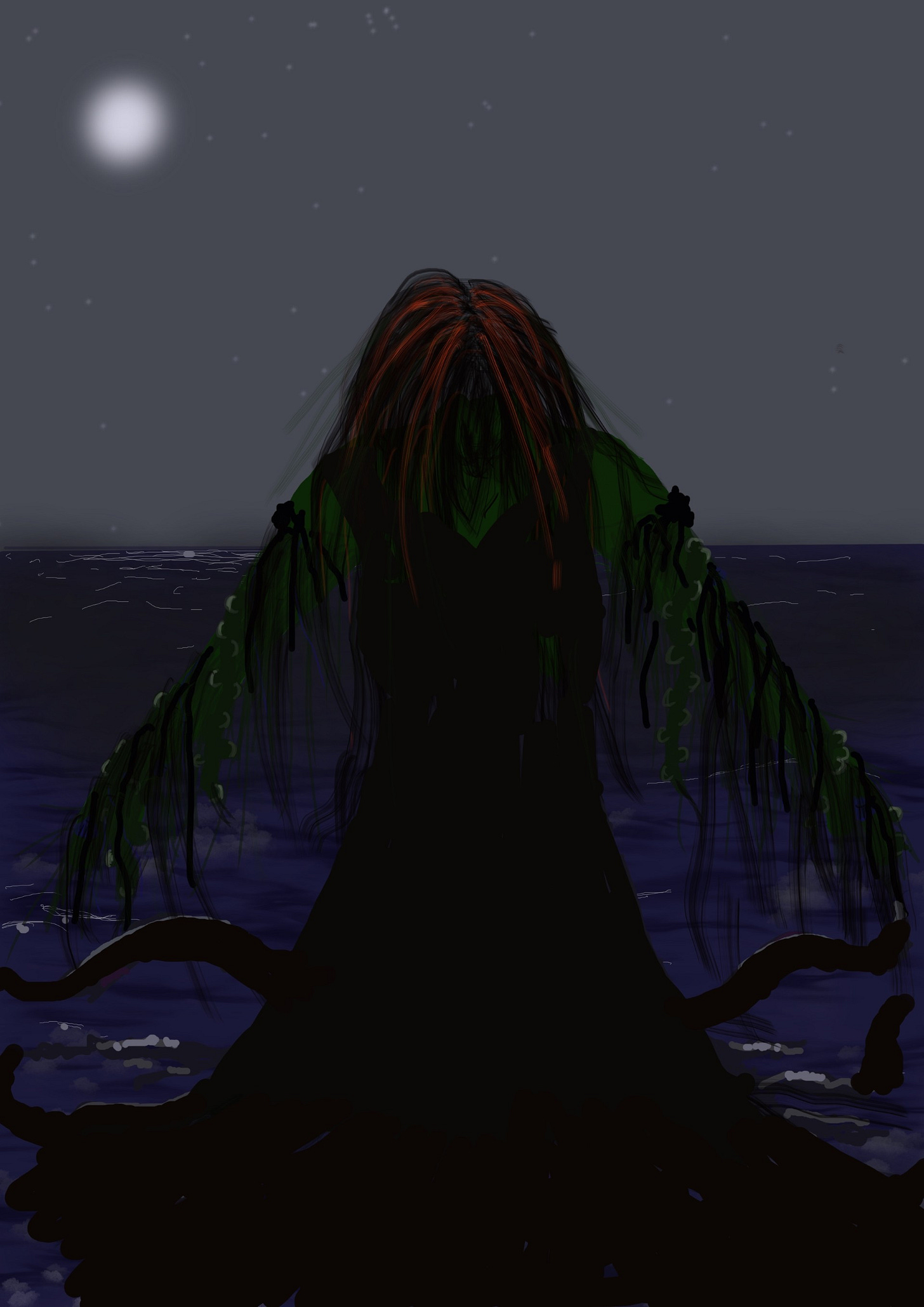 I see flickers of red tresses in the water, mixed with dark seaweed and a bloated, deformed figure begins to rise from the water. Hair tangled and knotted with coral and kelp and … faces? Faces that drift in and out of my vision. Haunted visages. Their features come and go like the tides - a girl I played with once. A boy who sold apples at the market. All gone before me, eyes turned toward me, hungry and keen.